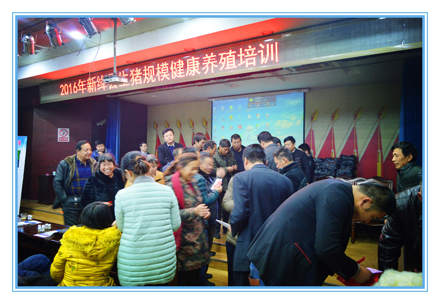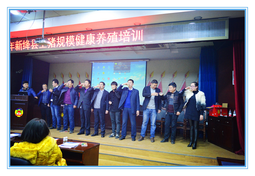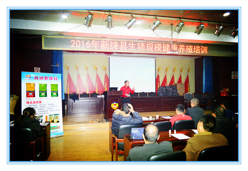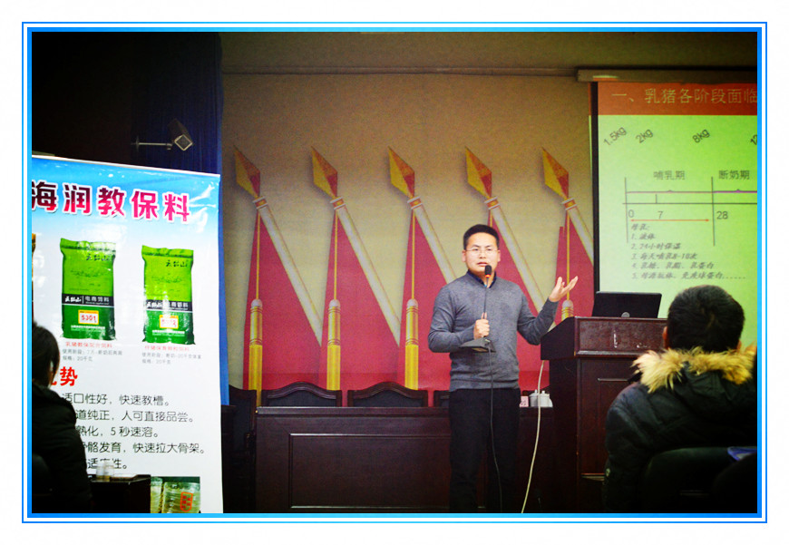 2016年12月18日下午,我公司在絳州賓館成功舉行了新絳縣生豬規模健康養殖培訓暨海潤教保料產品技術推介會。全縣近200家豬場老板及相關人士參加了會議。出席會議的嘉賓有:山西海潤牧大飼料有限公司總經理李新衛,養殖專家杜一等相關人士。 杜一專家為養殖戶分享《養豬持續經營之道》